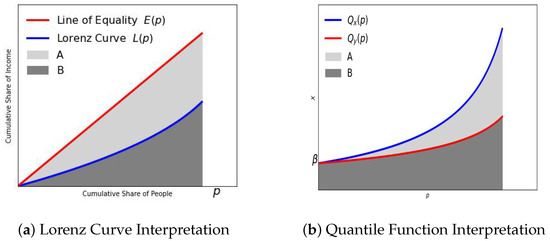 If the means μ x and μ y represent the areas ( A + B ) and B under the corresponding quantile functions, we can interpret the Gini coefficient as follows: The Gini coefficient G is equal to the area ( A + B ) below the quantile function of X minus the area B below the quantile function of Y divided by the area ( A + B ) below the quantile function of X. In other words, G = A / ( A + B ) . This is illustrated in Figure 4b. This explanation is analogous to the explanation of G in terms of the Lorenz curve shown in Figure 4a.