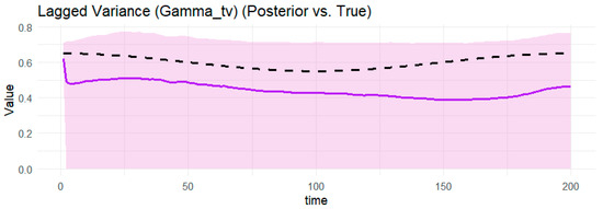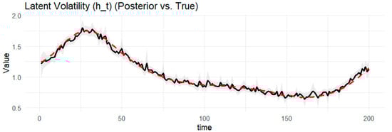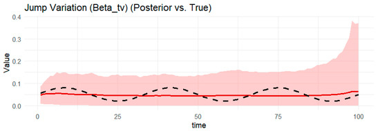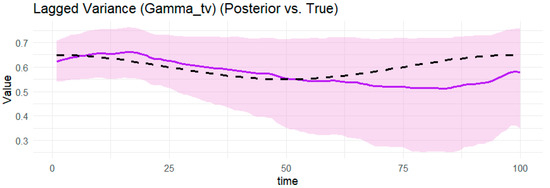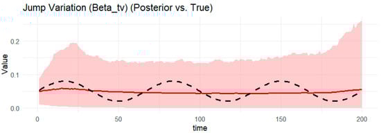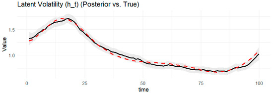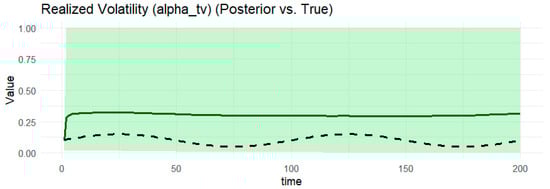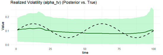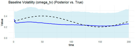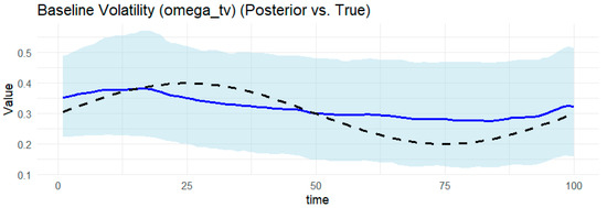 Notes: Table 1 provides the posterior estimates of static parameters ( ω g , α g ,     β g , γ ) from the BtvGARCH-Itô model for simulated datasets (N = 100 and N = 200). Posterior sampling was performed using four parallel Markov chains with 1000 iterations and each chain with 500 warm-ups. Computations were carried out using the cmdstanr interface to the Stan R package (The model code was implemented in R 4.5.1 and the supporting material is available online at https://www.preprints.org/manuscript/202507.1745/v1, accessed on 17 July 2015). The models converge well, as indicated by the convergence diagnostic test, in which the R ^ values are less than 1.02 and the effective sample sizes are sufficient. l o g p θ Υ indicates the log posterior density evaluated at the posterior mean of the parameter vector θ , and σ k g , t presents standards deviations of weakly informative priors for the posterior time-varying means estimated in this model. The time-varying posterior means estimates of BtvGARCH-Itô and their corresponding true parameter values are presented in Figure 1, Figure 2, Figure 3, Figure 4, Figure 5, Figure 6, Figure 7, Figure 8, Figure 9 and Figure 10.