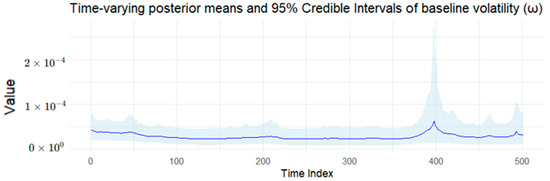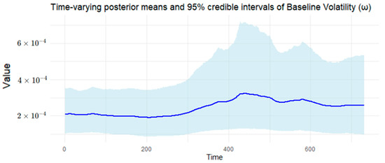 Figure 16. Time-varying posterior means of Baseline Volatility (Bitcoin). Notes: It presents the time-varying posterior means (solid lines) and 95% credible intervals (shaded areas) for all parameters estimated from the BtvGARCH-Itô model using 1-min close prices of Bitcoin (BTC) from 1 January 2023 to 1 January 2025.