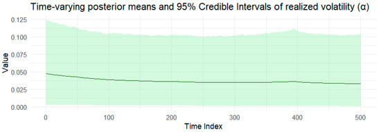 This section presents the performance of the BtvGARCH-Itô model compared to the original GARCH-Itô specification for two simulated data sample sizes. Table 1 presents the posterior mean estimates of the static parameters and their associated diagnostics, including posterior intervals, R hat values, and effective sample sizes. The posterior means for ω g indicate the baseline level of volatility, α g captures the impact of realized volatility, β g measures the contribution of jumps, and γ reflects the persistence of latent volatility. Table 2 compares the estimated parameters from GARCH-Itô and BtvGARCH-Itô against the true parameter values. The results clearly show that the BtvGARCH-Itô posterior means are closer to the true values across all parameters and sample sizes, highlighting the model’s improved estimation accuracy. Table 3 further confirmed this through prediction accuracy metrics (MAE, MSE, RMSE) in which the BtvGARCH-Itô model consistently achieves lower errors for both static coefficients and latent volatility h t . Figure 1, Figure 2, Figure 3, Figure 4, Figure 5, Figure 6, Figure 7, Figure 8, Figure 9 and Figure 10 present the posterior time-varying estimates of means and 95 percent credible intervals of parameters. In sum, these simulation results demonstrated that the BtvGARCH-Itô is capable of more accurately estimating volatilities under a realistic synthetic dataset. Furthermore, this model can be used to estimate both static and time-varying coefficients. Thus, it supports the practical application to volatility analysis in empirical financial markets.