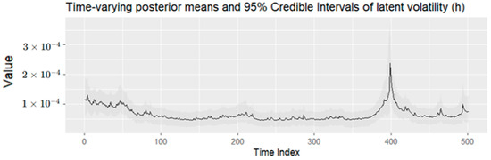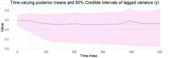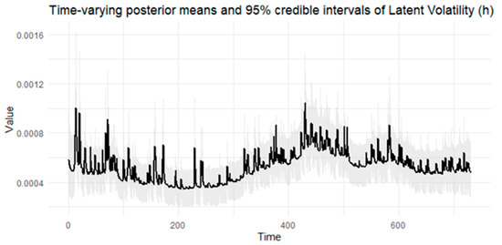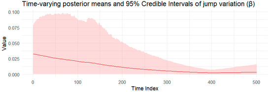 Notes: Table 5 provides the posterior estimates of static parameters ( ω g ,   α g ,   β g ,   γ ) from the BtvGARCH-Itô model for Bitcoin (BTC) intraday returns between 1 January 2023 and 1 January 2025. Posterior sampling was performed using four parallel Markov chains with 2000 iterations and each chain with 1000 warm-ups. Computations were carried out using the cmdstanr interface to the Stan R package. The models converge well, as indicated by the convergence diagnostic test, in which R ^ values are not greater than 1.00, and the effective sample sizes are satisfactory. l o g p θ Υ indicates the log posterior density evaluated at the posterior mean of the parameter vector θ , and σ k g , t presents standard deviations of weakly informative priors for the posterior time-varying means estimated in this model. The time-varying posterior means and 95 percent posterior intervals are presented in Figure 16, Figure 17, Figure 18, Figure 19 and Figure 20.