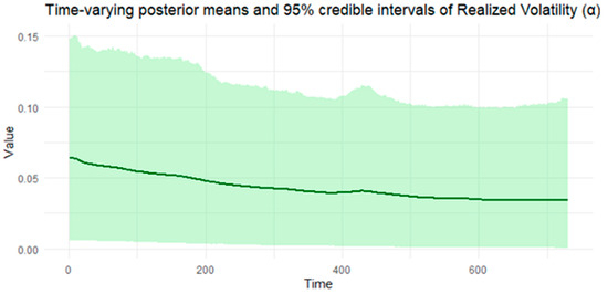While the estimated static posterior means of the parameters present fixed volatility of the market, it proves overly restrictive in high-frequency data and continuously changing financial environments. This model addresses this by allowing parameters to vary over time to more accurately examine the dynamic nature of investor behavior, risk perceptions, and volatility transmission mechanisms. The time-varying estimates of the parameters, including latent volatility, are provided in Figure 11, Figure 12, Figure 13, Figure 14 and Figure 15 for the S&P 500 and Figure 16, Figure 17, Figure 18, Figure 19 and Figure 20 for Bitcoin. Those figures reveal intraday shifts in volatility, showing how realized volatility and latent components fluctuate over time. The time-varying estimates provide insights into regime changes and help capture short-term market responses to macroeconomic announcements or shocks. With this method for modeling volatility persistence and shifts, investors can benefit from value-at-risk estimation and derivative pricing. The evidence from both assets supports the conclusion that while static models reveal the overall market behavior, time-varying models report unexpected shifts in volatility drivers that affect market risk. In sum, the empirical evidence validates the efficacy of the BtvGARCH-Itô model in analyzing dynamic volatility structures across both traditional and digital financial assets.