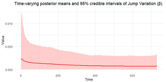 Figure 18. Time-varying posterior means of Jump Variation (Bitcoin). Notes: It presents the time-varying posterior means (solid lines) and 95% credible intervals (shaded areas) for all parameters estimated from the BtvGARCH-Itô model using 1-min close prices of Bitcoin (BTC) from 1 January 2023 to 1 January 2025.