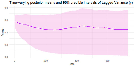 Figure 19. Time-varying posterior means of Lagged Variance (Bitcoin). Notes: It presents the time-varying posterior means (solid lines) and 95% credible intervals (shaded areas) for all parameters estimated from the BtvGARCH-Itô model using 1-min close prices of Bitcoin (BTC) from 1 January 2023 to 1 January 2025.