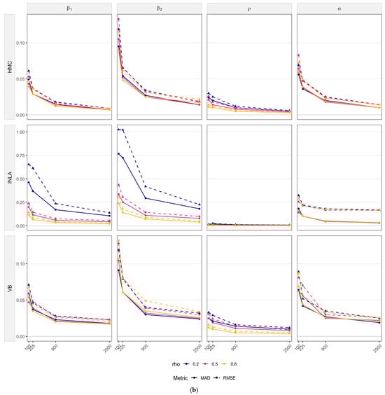 Turning to method-specific behavior, HMC produces the most concentrated posteriors at small and moderate , with the posterior mean closely aligned to the true value for all parameters and all levels in Figure 1a. Consistent with this, HMC attains the lowest RMSE and MAD at small in Figure 1b. VB exhibits slightly wider spreads and small shifts at , most visible for and when , but its errors fall quickly. By , VB is practically indistinguishable from HMC. INLA, however, displays a persistent upward shift for the variance parameter across , yielding the largest RMSE and MAD for across different sample sizes. For the remaining parameters, however, INLA’s accuracy converges to the levels of HMC and VB as grows. This pattern may be attributed to INLA’s treatment of all components on the right-hand side of SLMs as random effects.