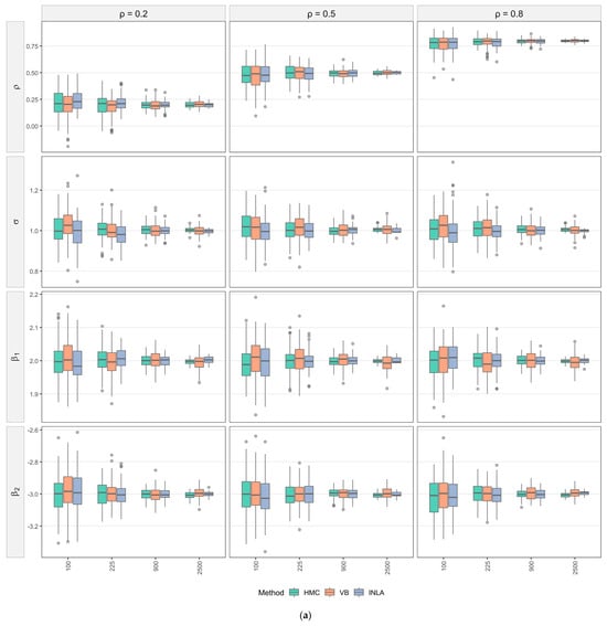 Considering parameters individually, the spatial autocorrelation coefficient is estimated well by all methods. Errors are small even at and display little sensitivity to different levels of (Figure 1a). The variance parameter is the most challenging for estimation. HMC and VB show mild overestimation only at and approach near-zero error by , whereas INLA’s upward bias persists across sample sizes. For the regression coefficients and , biases are small overall. INLA has a wider interquartile range (IQR) and a few outliers when , but the accuracy of all three methods improves steadily with increasing .