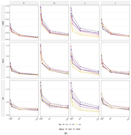 Figure 2a,b present the simulation results for SEM models. Overall, the results (see Table S2 of Online Supplementary Materials) show that parameter bias remains minimal, while precision and estimation accuracy consistently improve as sample size increases. The largest gains occur, from to , posteriors tighten markedly and both RMSE and MAD decline sharply. Beyond that, improvements are gradual. The same behavior holds across different levels of spatial dependence.