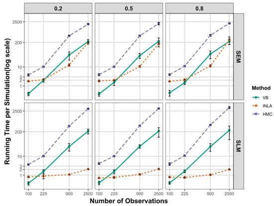 A similar pattern emerges in the SLM scenarios (bottom panels). VB continues to scale better than HMC as the sample size increases. However, INLA demonstrates the best scalability for large datasets in this case. For , INLA completes a simulation in as little as 2 s, compared to 220 s for VB and approximately 3100 s for HMC.