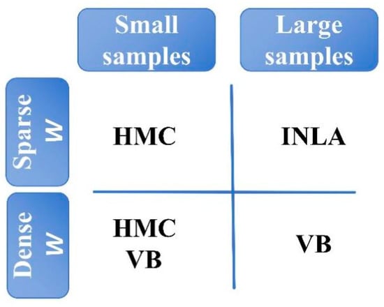 - Taylor, B. M., & Diggle, P. J. (2014). INLA or MCMC? A tutorial and comparative evaluation for spatial prediction in log-Gaussian Cox processes. Journal of Statistical Computation and Simulation, 84(10), 2266–2284. [Google Scholar] [CrossRef]