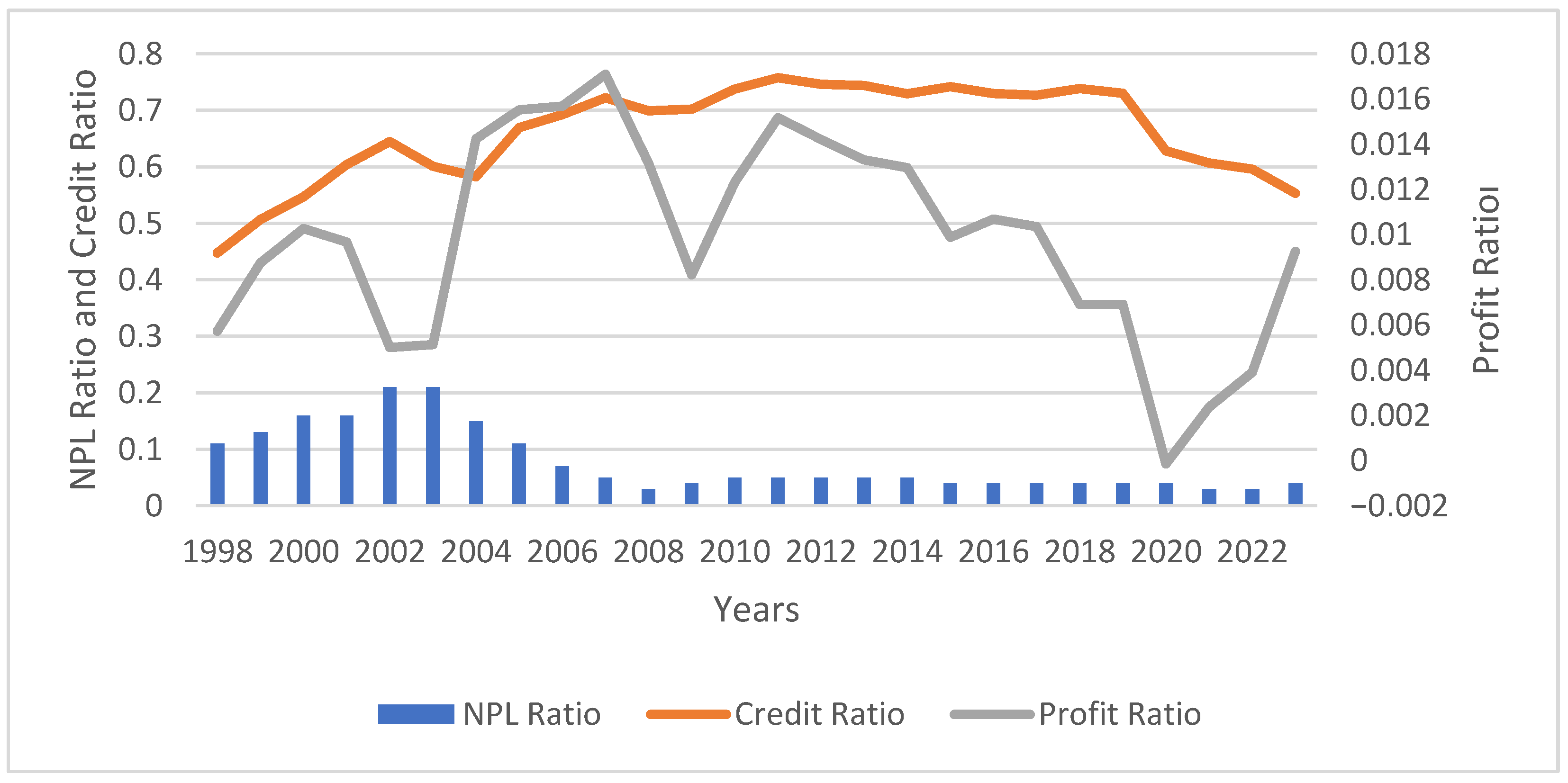 Table 1, the NPL ratio shows the ratio of NPLs to total loans, the credit ratio represents the proportion of total credits to total assets, and the profit ratio presents the contribution of net profit to total assets.
