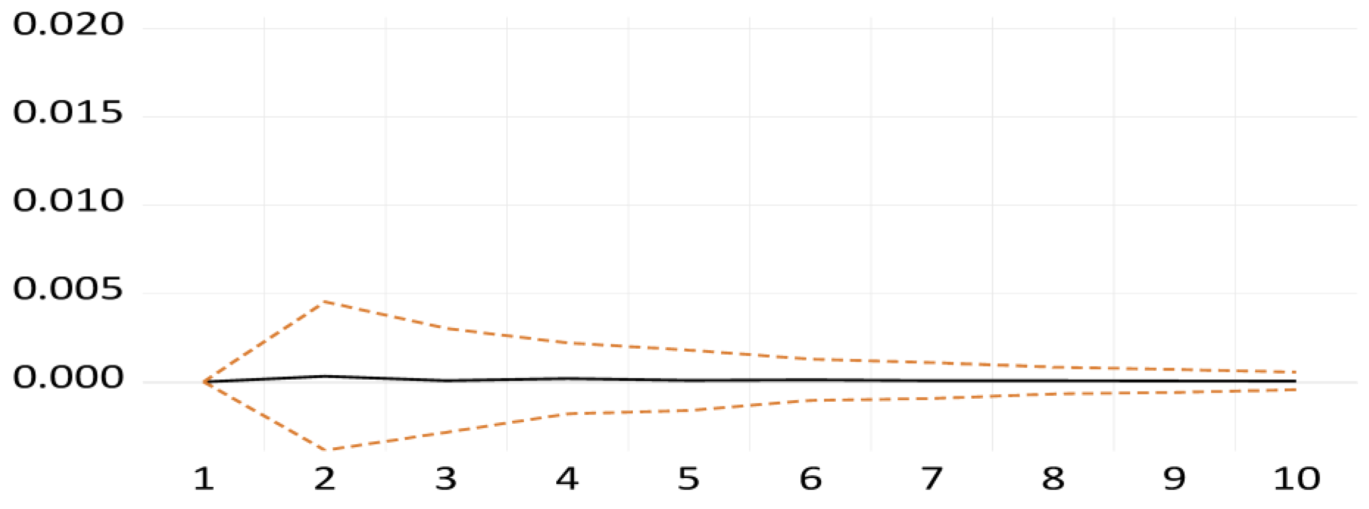 Figure 7 shows the reaction or response of the NPL ratio when the credit ratio changes. In this graph, the horizontal axis, labelled from 1 to 10, represents the number of periods, and the vertical axis represents the magnitude of the response of the NPL ratio. According to the graph above, the unexpected one-standard-deviation increase in the credit ratio appears to have no statistically significant impact on the change in the NPL ratio over the 10 periods following the shock. Therefore, it can be claimed that shocks to the credit ratio do not significantly influence the level of the NPL ratio.