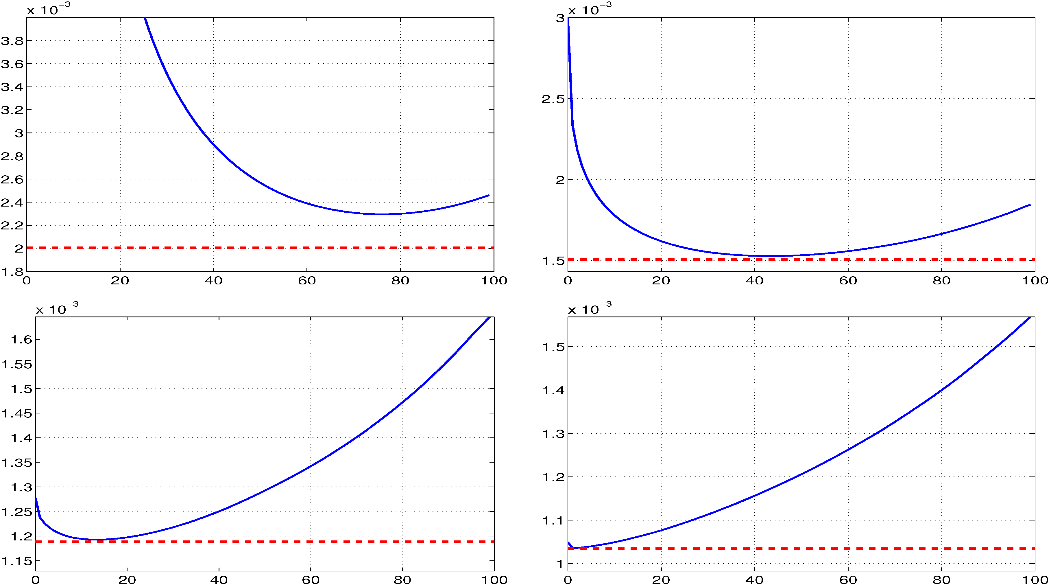 The MSE of trimmed mean as a function of α, for estimating location parameter μ of the i.i.d. Student’s t data with known scale one and degrees of freedom one (top left); three (top right); 10 (bottom left) and 50 (bottom right), based on a sample size of observations. The vertical axis was truncated to improve the appearance. The dashed line in each plot is the MSE of the MLE of μ.