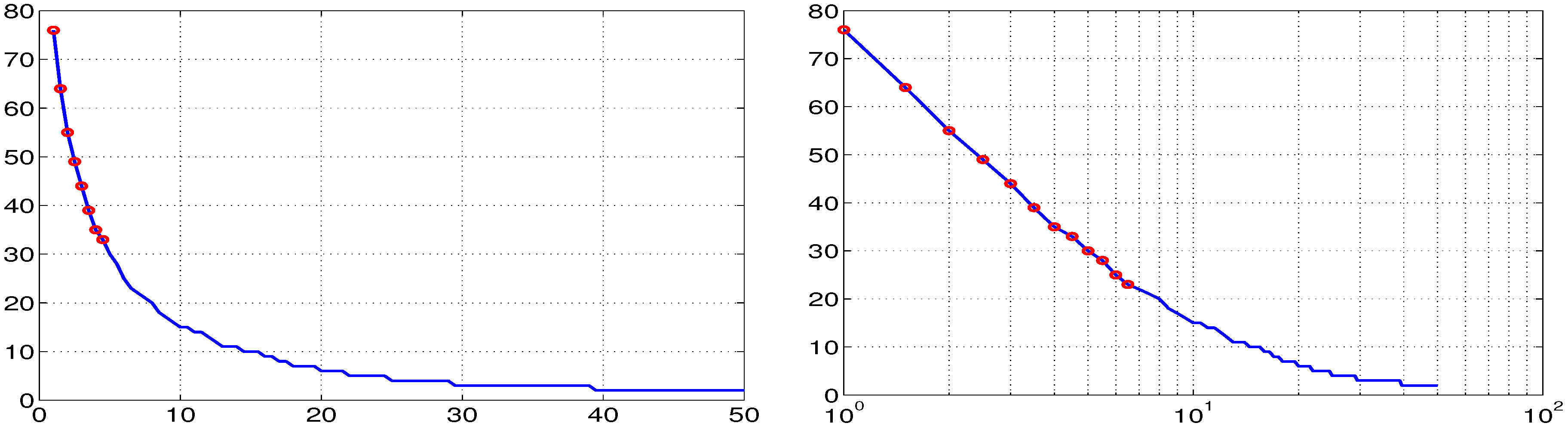This procedure was then conducted for the 99 values , and the optimal value of α, , was determined. The results are shown in Figure 2. The left panel plots k versus and shows that the behave as expected. The right panel shows the log plot, which reveals an almost linear structure of for low values of k.