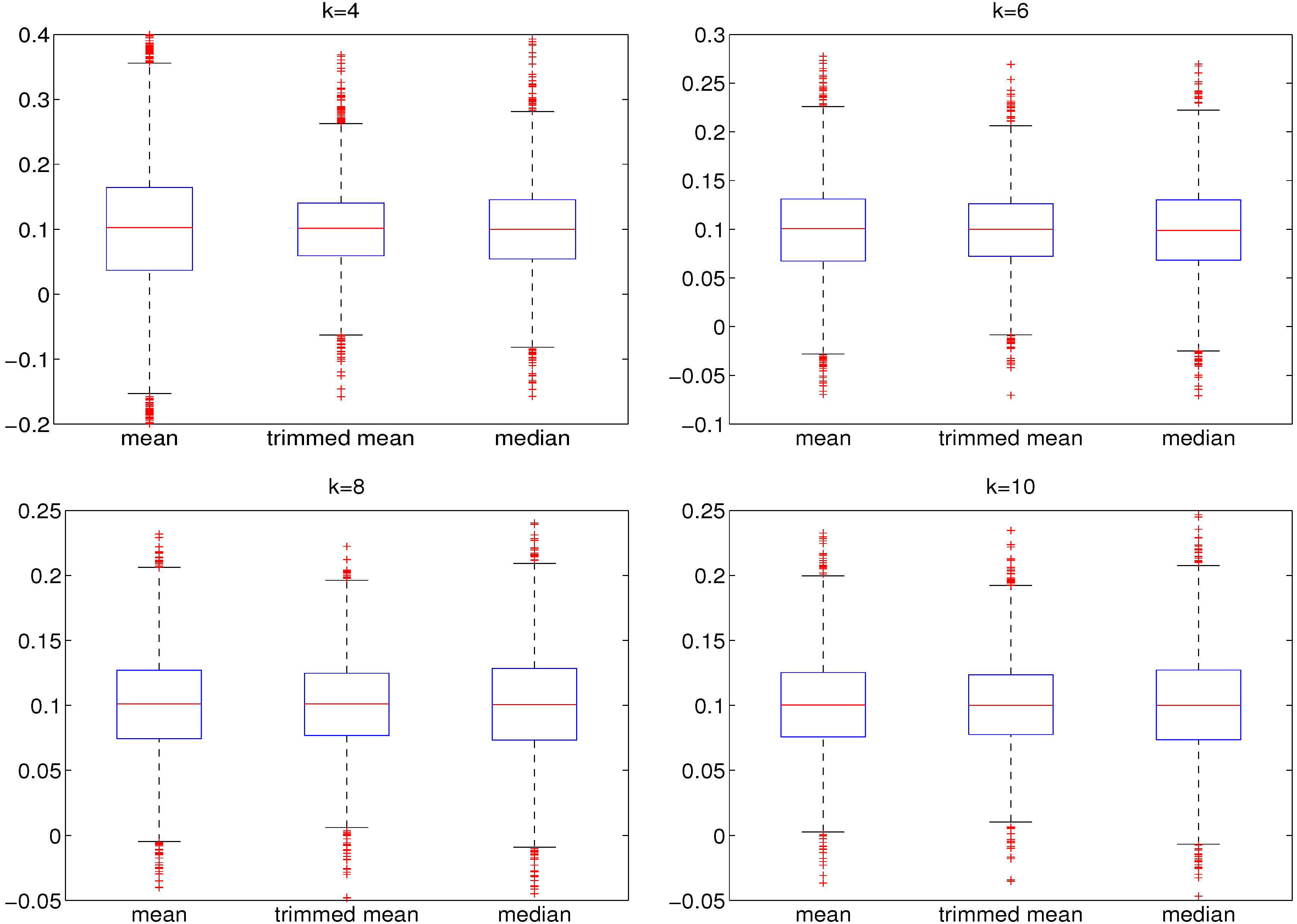 | Model | Number Of Entries | Number of Quantiles | k | RMSE of the Mean | RMSE of the Trimmed Mean Procedure | RMSE of the Median |