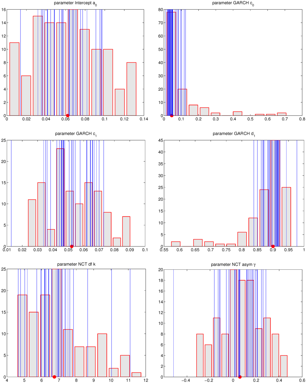 MLE parameter estimates corresponding to the NCT-GARCH model, for the DJIA-30 data, using non-overlapping windows of length , over 20 years of data and the 30 time series. The circle on the x-axis indicates the median of the data. Blue lines refer to the average parameter value for each of the 30 assets.