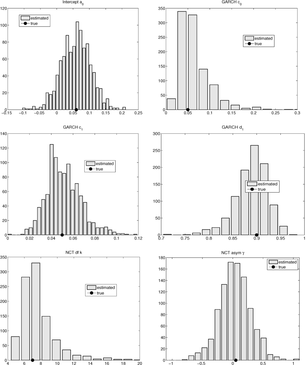 This can be compared to Figure 5, which shows the computation corresponding to (ii), i.e., the MLE simulation results based on series of length , generated from an NCT-GARCH process with parameters , , , , , and . The corresponding two figures for were also computed and are similar, though look even less Gaussian than the case with ; and are available upon request. Also, the simulation in (ii) was conducted using , to confirm the consistency and asymptotic normality of the estimators. We see that the variation of (i) is, as hoped, smaller than that of (ii), for GARCH parameters and , though it is not quite the case for parameter , because of the elongated left tail in the distribution for in Figure 4. However, most of the mass is indeed centered around the value . As such, this exercise lends some evidence that we can forgo the estimation of the GARCH parameters, but it remains to be seen what effect this has on out-of-sample performance for density and VaR prediction. This is done below in Section 3.