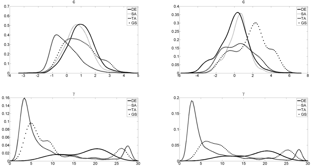 To sum up, all starting-value search procedures work equally well in the equation-by-equation approach. The heuristics, DE somewhat more pronounced than the others, are already quite successful in the starting-value search. As can be seen from Figure 1, the parameter estimates for Γ and C confirm these outcomes as the curves are practically identical.16 The figure refers to the first equation for VSTAR1-1 but the outcomes for the other equation as well as VSTAR1-2 are similar.17 In more than 95% of the simulated cases, the parameter estimates do not differ by more than 0.01 across all procedures in the simulation runs. This is true for the starting-value search as well as for the optimization.