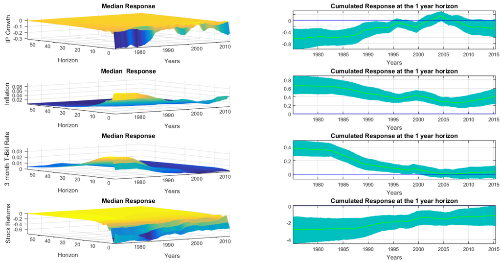 Figure 6 plots the time-varying impulse response to a one standard deviation shock to . Following [5], the impulse responses are computed assuming that the parameters are fixed at their estimated values and that they do not vary over the impulse response horizon. As shown by [21], this assumption based on ‘anticipated utility’ provides a reasonable approximation to the underlying object of interest.