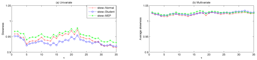 As far as financial applications are concerned, modelling and inference based on the normal distribution have often been proven to be of limited usefulness, as it is possible to gain statistical efficiency by allowing for more involved distributions featuring heavy tails and skewness. As a way to capture higher moments, the literature offers several alternatives. For example, the multivariate noncentral t distribution has fat tails and is skewed; however, the skewness is linked directly to the location parameter, making it somewhat inflexible. The lognormal distribution has also been used to model asset returns, but its skewness is a function of its mean and variance, not a separate parameter. Others, such as the generalized hyperbolic (GH) or mixtures of distributions have also been employed in financial applications, despite being more computationally demanding (see Barndorff-Nielsen [27] for an introduction and Paolella and Polak [28] for a recent application).