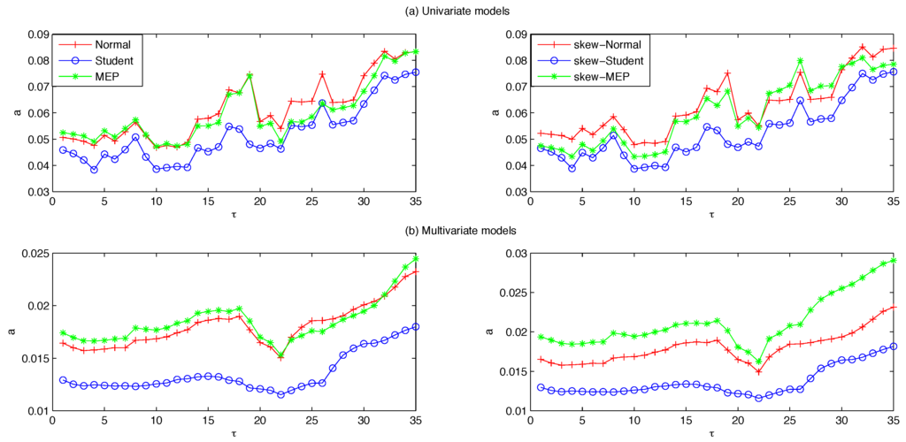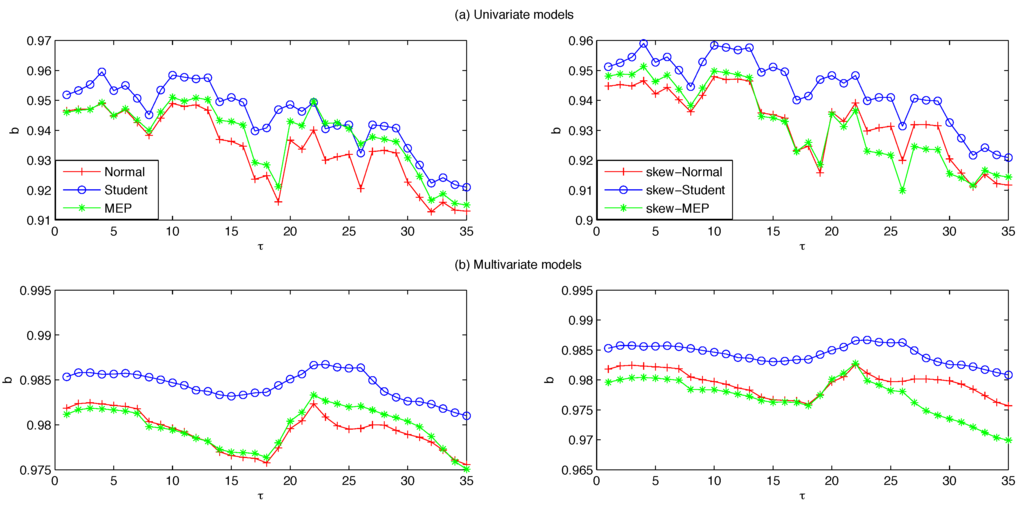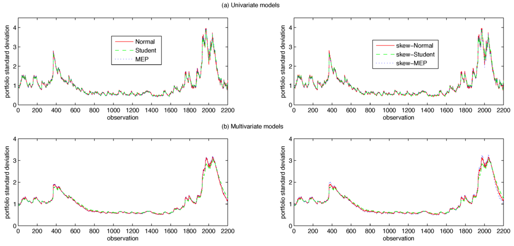 In order to shed some light on this issue, several papers focus on direct comparison of the predictive performance of univariate and multivariate GARCH (MGARCH) models under various distributional assumptions with the aim of providing evidence in favour of one of the two approaches. Key studies in this literature include Giot and Laurent [11] and Santos et al. [12]. In the first, the authors compare the univariate APARCH model with a multivariate TVC-APARCH combined with the normal, Student and skew-Student distributions, showing that in both the univariate and multivariate settings the latter produced superior VaR forecasts. In the second, the authors study a number of univariate and multivariate volatility models with normal and Student distributions, finding that the multivariate models combined with the Student offer superior out-of-sample performances.