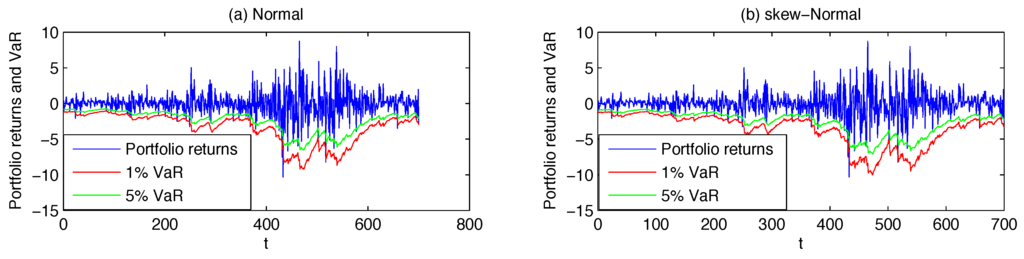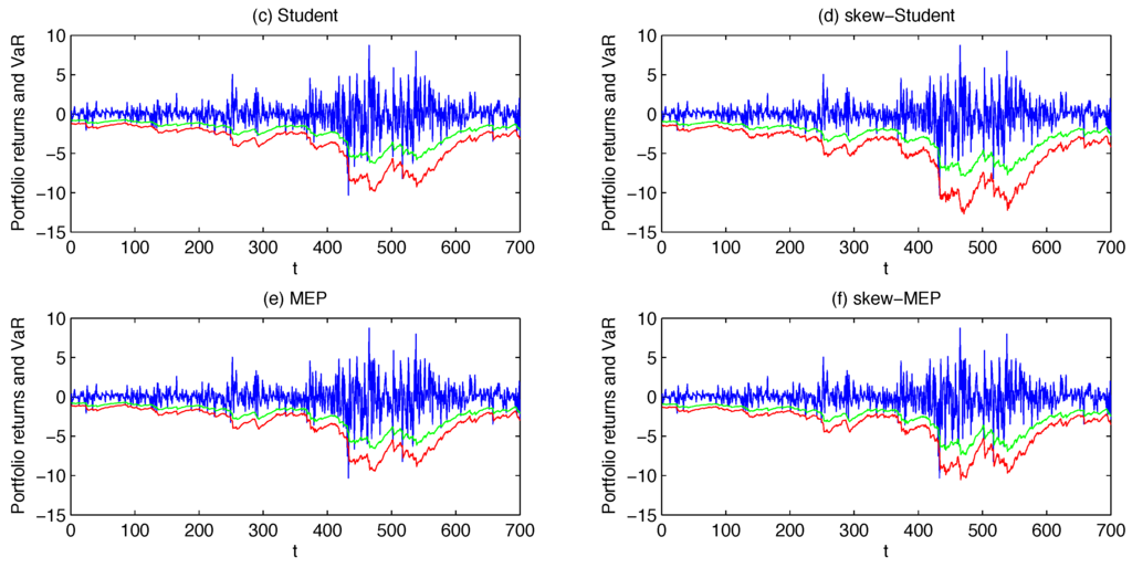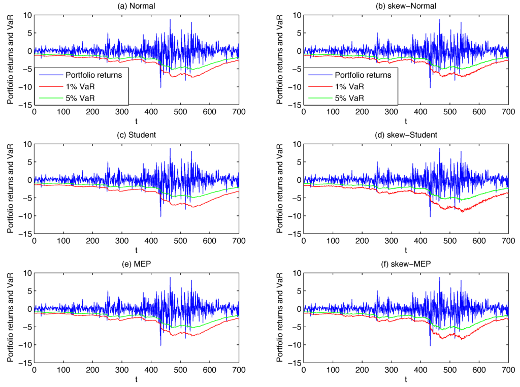 where and are respectively the portfolio mean and standard deviation and is the left quantile of the assumed conditional distribution at α%. As usually done in practical applications, the considered VaR confidence levels are and . Note that in the remainder of the paper we will set , thus considering a simplified analytical formula for the computation of the VaR which only accounts for the portfolio conditional variance. Alternative approaches, as done for example in Bauwens et al. [25], fit an ARMA-type structure to the portfolio conditional mean or just assume it to be constant over time (see Santos et al. [12]). Ultimately, when present, the dynamic dependence in the conditional means of portfolio returns is known to be weak and quite difficult to predict, thus assuming a zero mean will have a negligible effects on the VaR forecasts.