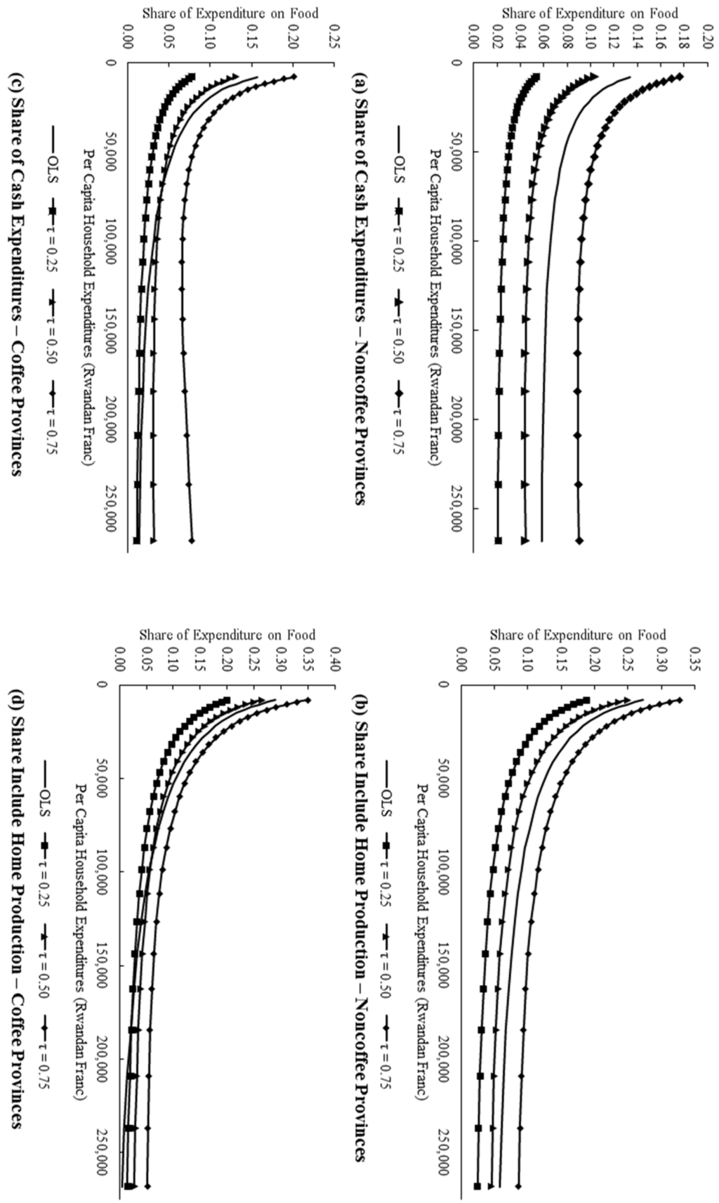 i.e., those households who spend the highest share of their income on food). Further focusing on the 1st Quartile of expenditures (e.g., the poorest of these households), the income elasticity is 0.5474 in the pooled results, 0.5923 for noncoffee provinces, and 0.5111 in coffee provinces. Intuitively, the households in the noncoffee growing provinces appear to be the most food insecure. We assume that a household with an annual expenditure per capita of 11,750 RWF (a somewhat round number approximately equal to the 1st Quartile). This household would spend 3374 RWF on food under the pooled estimates, 2338 RWF on food under the estimates for noncoffee growing provinces and 3714 RWF on food under the estimates for the coffee growing provinces. Hence, households in the coffee growing provinces spend more money on food and thus appear more food secure. However, if household income was to increase by five percent (e.g., 587.50 RWF) the pooled expenditure on food would increase by 322 RWF, the expenditures on food for noncoffee producing provinces would increase by 348 RWF, and the expenditures on food for coffee growing provinces would increase by 300 RWF. Essentially, the Working’s curve for coffee growing provinces is steeper for coffee growing provinces than for noncoffee growing provinces (which is reasonable comparing