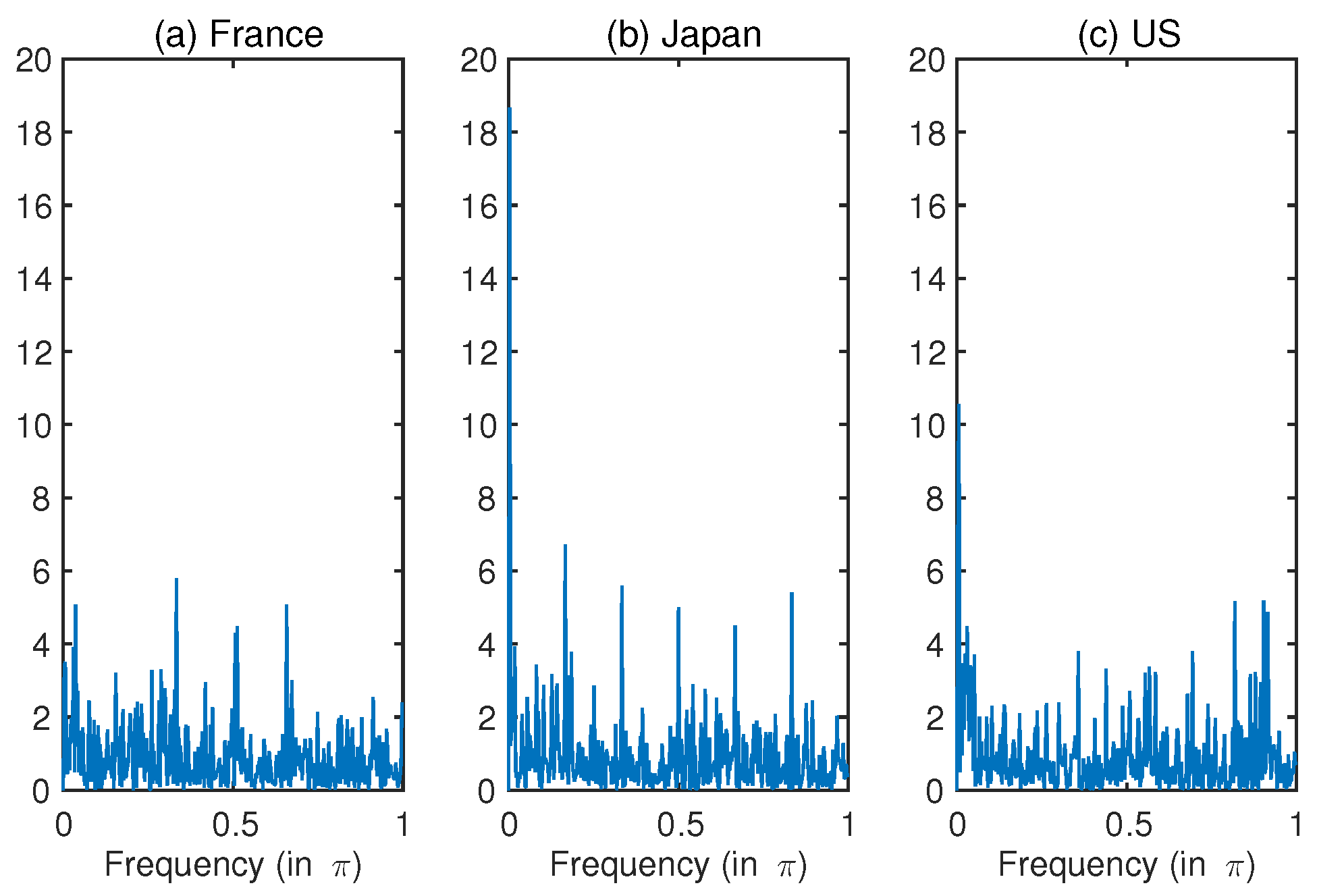 Figure 5 shows that there is a distinguished peak at zero frequency for the case of Japan and the U.S., implying that a short memory model model is adequate for France, while long-memory models are appropriate for the remaining two countries. Furthermore, Japan also has five other periodic peaks, implying a multiple periodic long-memory. For estimating the GARMA-SV model when