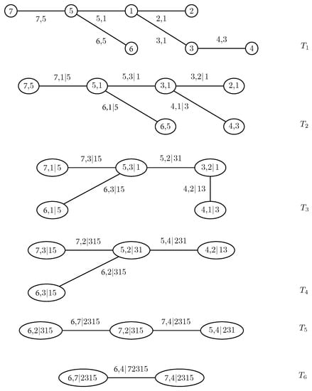 To determine the edges in , we combine the numbers in the bottom row with the diagonal elements in the corresponding columns, i.e., the edges are (6,5), (7,5), (5,1), and so on. The edges of are given by the numbers in the second row from the bottom, associated with the diagonal elements, conditioning on the elements in the bottom row, namely (6,1|5), (7,1|5), etc. Proceeding like this, the only edge in is found by coupling the two upper elements in the leftmost column with the remaining five entries of the column as a conditioning set, i.e., (6,4|72,315).