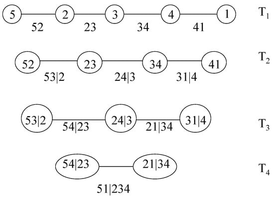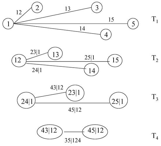 In financial applications, two special cases of regular vines have mainly been used. These are denoted canonical vines and D-vines, respectively [19]. Each model gives a specific way of decomposing the density. Figure 2 shows the specification corresponding to a five-dimensional D-vine. It consists of four trees . Tree has nodes and edges. Each edge corresponds to a pair-copula density, and the edge label corresponds to the subscript of the pair-copula density, e.g., edge corresponds to the copula density . The whole decomposition is defined by the edges and the marginal densities of each variable. The nodes in tree are only necessary for determining the labels of the edges in tree . As can be seen from Figure 2, two edges in , which become nodes in , are joined by an edge in only if these edges in share a common node.