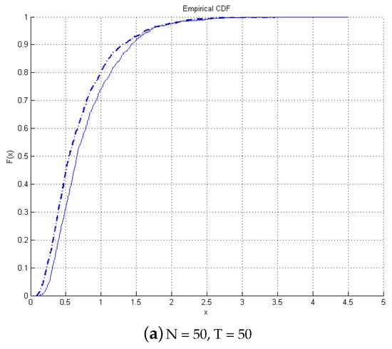 Next, we look into graphical comparisons between empirical and asymptotic distributions of the test presented in Figure 1. The continuous lines are the asymptotic distributions, and the dotted lines are the empirical CDF. It is found that even with a small T, there is no size distortion, and the empirical distribution matches closely the asymptotic distribution. As T increases, the two distributions overlap.