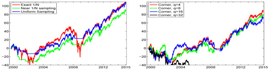 The left panel of Figure 2 plots the cumulative returns resulting from a one dollar initial investment using the equally weighted portfolio (“exact ”); only sampling around the equally-weighted portfolio (“near- sampling”) via use of ; and using only uniform sampling. The right panel of Figure 2 is similar, but showing the result of using corner sampling, via (10), with different values of q. Both uniform and near- sampling result in performance very similar to that of the exact portfolio, though in the years 2000 to 2003, the near- sampling lost substantially relative to the others, but after that, the cumulative returns run approximately parallel.
