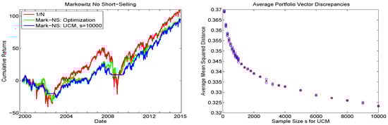 With , observe that, for some time periods (for which we use moving windows of length ), there will be no solution to the portfolio problem, and the portfolio vector consisting of all zeros is returned; i.e., trading, is not conducted on that day. The left panel of Figure 3 shows the resulting cumulative returns (including those for the equally weighted portfolio), from which we see that, even for , the UCM with uniform sampling is not able to fully reproduce the optimized portfolio vector results. They differ substantially only during periods for which the UCM method is not able to find a portfolio that satisfies the mean constraint. The average portfolio vector discrepancies, as a function of s, are plotted in the right panel. The trajectory indicates that is not yet adequate, and that the primary issue arises during periods for which relatively few random portfolios will obtain the desired mean constraint. Based on this analysis, it is clear that brute-force sampling will not be appropriate, and more clever sampling strategies are required.