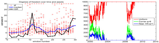 The left panel of Figure 4 plots the individual associated with the aforementioned data set of 29 stock returns, using 30 moving windows of length 250 and incremented by 125 days, along with their median and IQR values. We see that their median values move reasonably smoothly over time, ranging from about five to eleven, while their IQR can vary and change quite substantially, though it tends to be very low most of the time. Observe that, in the beginning of the data, from 2000 to 2003, both the median and IQR are very low, so that, according to our idea, relatively more corner solutions should be searched; and from Figure 2, this is precisely where there is a noticeable increase in performance when using corner solutions, with .