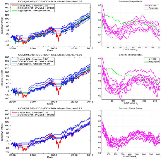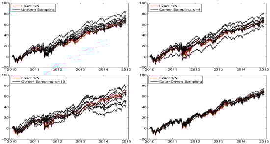 For the data-driven sampling (DDS) method, the average total cumulative return, over the eight runs, is virtually the same as that of the exact portfolio; but the average Sharpe ratio is 1.05. Summarizing, for these five years of data, the attained Sharpe ratio of our proposed UCM method, based on uniform sampling and DDS, are 1.10 and 1.05, respectively; these being higher than that of the exact portfolio (0.94). While it would seem that uniform sampling is thus (slightly) superior to the data-driven method, we see that the variation over the eight runs is substantially lower for the data-driven scheme compared to uniform sampling (and certainly compared to corner sampling), indicating that more than samples are required for latter sampling methods to obtain reliable results. In particular, the data-driven method has, for a given s, a higher probability of finding the portfolio weight vector that satisfies (11), whereas, with uniform sampling, it is more “hit or miss”.