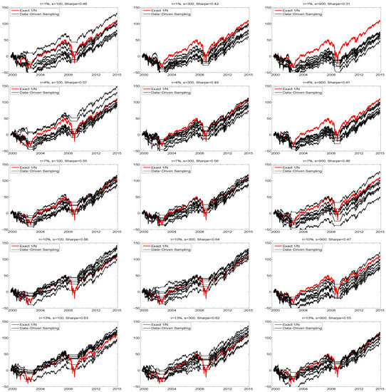 Hair plots, based on window size , of eight cumulative return sequences of the DJIA data (from June 1999 to December 2014), using data-driven sampling. The yearly percentage return, , and number of samples, s, are indicated in the titles, along with the attained annualized Sharpe ratio as the average over the eight sequences. The thicker red line shows the cumulative return performance of the equally weighted portfolio.