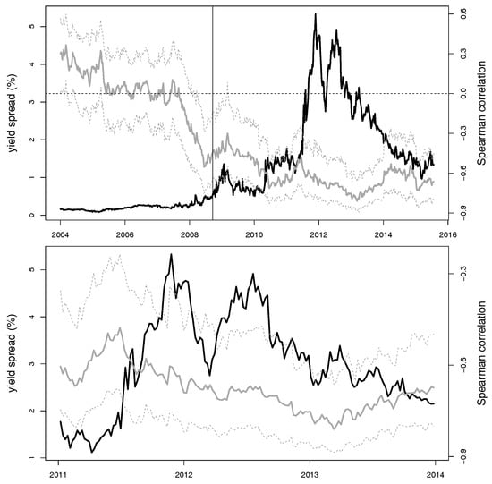 In the Upper Panel, the black solid line shows the evolution of the Italian yield spread. The solid gray line indicates the rolling 1-year Spearman’s rank correlation between FTSE Italy All Share Bank Index and the 10-year yield spread (the gray dotted lines give the 95% confidence interval); The Bottom Panel highlights the period 2011–2013.