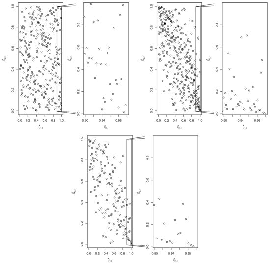 In order to focus on rank-invariant dependence, we further compute the so-called pseudo-observations : Therefore, for each time series and sub-period, the estimated standardized residuals have been sorted and scaled by ,5 where n stands for the sample size (). Figure 2 shows the scatter plot of pseudo-observations for the yield spread against the returns of the banking index , separately for the first (Upper Left Panel) and second period (Upper Right Panel), respectively, with a focus on the period 2011–2013 in the Bottom Panel of Figure 2. By focusing on the enlarged Right Rectangles of the bivariate distributions (which focus on the upper tail sets of the time series), for the second period we notice an increased (negative) dependence between high changes in the yield spread and low returns of the banking index, as previously quantified and shown in Figure 1; i.e., the Italian banking industry seems to suffer more under a severe increase in the sovereign default risk during the second period than during the first one.