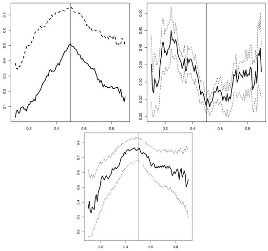 In order to analyze the behavior in the tails and to better understand the change observed in the second period, the Upper Left Panel of Figure 3 shows the estimated quantile dependence (also called tail concentration function, see () and ()) for the first period (solid line) and the second period (dashed line), respectively, by conditioning on the the yield spread. Once again, a focus on the period 2011–2013 is provided in the Bottom Panel of Figure 3. The upper quantile dependence is defined by