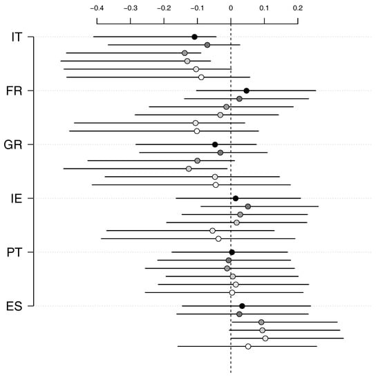 where indicates the operator to calculate the Spearman correlation and the chosen quantile value. Figure 4 shows the for extreme pseudo-observations of changes in the yield spread by choosing with the 95% bootstrap confidence interval in the second period. Although the is negative, which indicates that the dependence in the tails is smaller than in the center, we cannot claim that our findings are statistically significant in the second period (as also confirmed by the formal test of contagion shown in Figure 7). Therefore, in line with other papers (; ; ), we cannot claim that contagion effects caused the increased dependence in the recent past (compared to (); ()). We repeated the same exercise for other EU countries. Interestingly, the same conclusion—an unclear picture of contagion effects—applies to France (one core European country) and other peripheral countries (i.e., Greece, Ireland, Portugal, and Spain, respectively); see Figure 4.