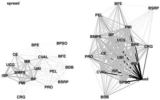 In Figure 5, we use a network representation to compare the dependence of pseudo-observations between changes in the yield spread and the returns of the single constituent Italian banks.6 The width of the lines shows the extent of the dependence, and the gray (respectively, black) color indicates a positive (respectively, negative) correlation.