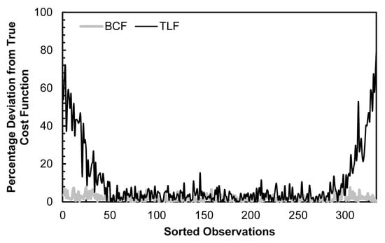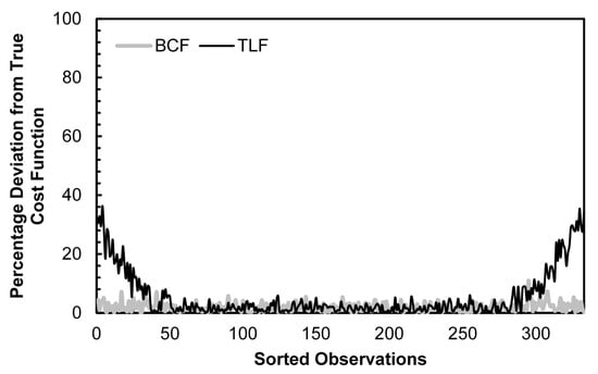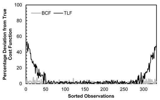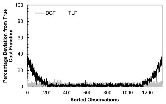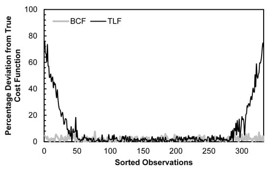 Figure 1 provides a graphical representation of the percentage deviation from the true cost function for the BCF and TLF estimates using the generalized Cobb-Douglas data generating process, a second-order Fourier series approximation and normally distributed random errors. The horizontal axis shows observations sorted in order of increasing total cost. From the figure, we can see that the percentage deviation of the BCF remains low throughout the entire domain, while the TLF shows very large deviations at the boundaries of the domain. For the smallest observation, the TLF has a bias of about 50% while the BCF bias is only about 8%, a 5/6 drop. For the largest observation, the effect is even greater, at least a 9/10 drop.
