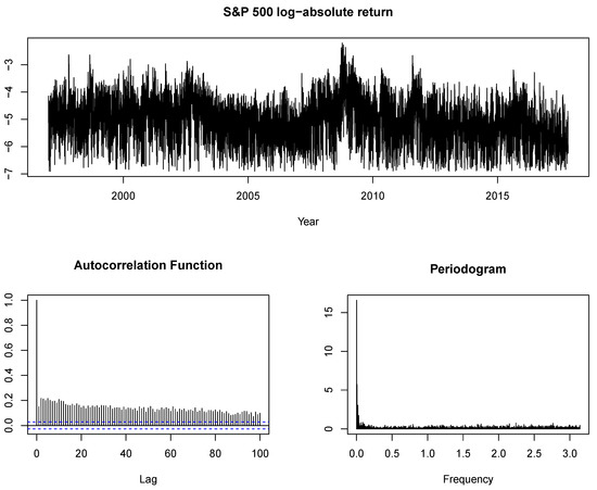 The log-absolute return series of the S&P 500 with the corresponding autocorrelation function and periodogram.
