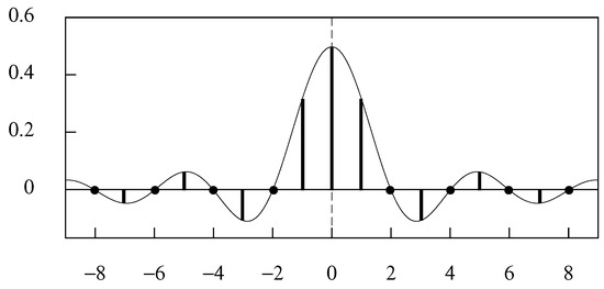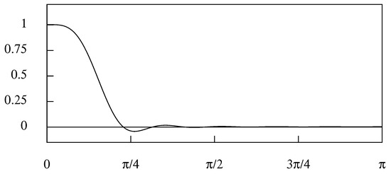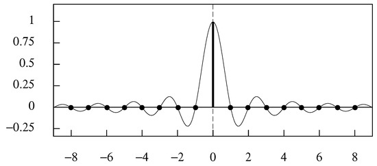 The two properties of (8) imply that is its own autocovariance function. Therefore, the condition that for , which is manifest in Figure 2, implies that the sequence constitutes an orthogonal basis for the set of all functions bounded in frequency by the Nyquist value of radians per unit (sampling) interval.