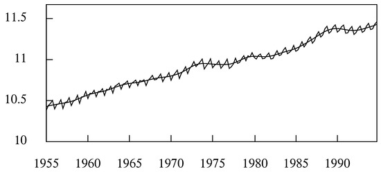 A trend, determined by a Henderson filter with 23 coefficients, interpolated through 160 logarithms of the quarterly household expenditure in the U.K. for the years 1955 to 1994.