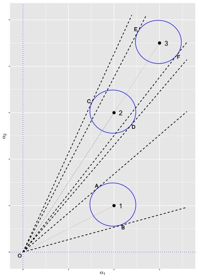 A first problem of the model (6) is that the latent random walk evolution on the Euclidean space is strange. Consider the special case and : in Figure 1, points 1–3 are possible locations of the latent variable . Suppose that the next state evolves as in (6) with a diagonal covariance matrix . The circles centered around points 1–3 are contour lines such that, say, almost all the probability mass lies inside the circles. The straight lines OA and OB are tangent lines to circle 1 with A and B the tangent points; the straight lines OC and OD are tangent lines to circle 2; and the straight lines OE and OF are tangent lines to circle 3. The angles between the tangent lines depend on the location of the points 1-2-3: generally, the more distant a point from the origin, the smaller the corresponding angle despite some special ellipses. The plot shows that the distributions of the next subspace based on the current point differ for different subspaces (angles for 3 and 2 smaller than the angle for 1); even for the same subspace (points 2 and 3), the distribution of the subspace is different (angle for 3 smaller than angle for 2).