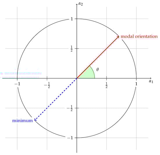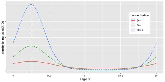 Figure 2 illustrates the Stiefel manifold and Figure 3 three matrix Langevin (not normalized) densities where , setting V (a scalar) equal to 1, for three values of D (a scalar); the smaller D, the flatter the density. In Figure 2, the modal orientation is shown for the densities of Figure 3, and the point at which the density values are minimal, this point being equal to . The densities are shown on Figure 3 as functions of the angle shown on Figure 2, for between 0 and , instead of being shown as lines above the unit circle. Rotational symmetry in this example means that, if we premultiply the random vector by any orthogonal matrix that does not modify the modal orientation, the densities are not changed.