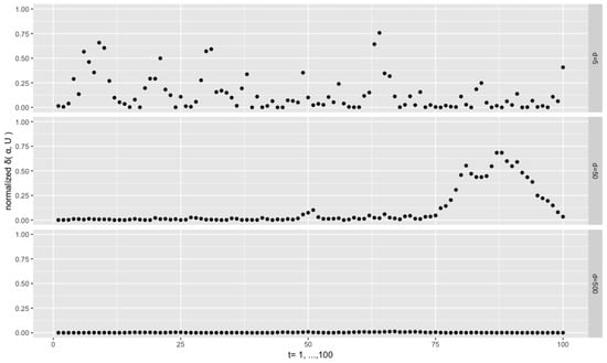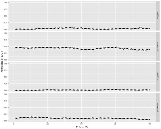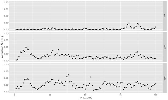 Figure 4 depicts the results from the setting , , and . We see that the sequences of the normalized distances are persistent. This is a common phenomenon throughout the experiments, and, intuitively, it can be attributed to the fact that the current depends on the previous one through the pair of and . For the low dimensional case , almost all the distances are very close to 0, which means that the filtered modal orientations are very close to the true ones, despite few exceptions. However, for the higher dimensional cases and 20, the distances are at higher levels and are more dispersed. This is consistent with the fact that, given the same concentration , an increase of the dimension the orthonormal matrix or vector goes along with an increase of the dispersion of the corresponding distributions on the Stiefel manifold, as the volume of the manifold explodes with the increase of the dimensions (both p and r).