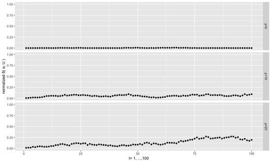 In the following experiments, our focus is on the investigation of the filtering algorithm when r approaches p. We consider the setting with the rank number , with and . Figure 8 depicts the results. The normalized distances are stable at a low level for the case with , but a high level (around 0.5) in the case with . A higher concentration () reduces the latter level to about 0.12, as can be seen on the lower plot of Figure 8. We conclude that the approximation of the true filtering distribution tends to fail when the matrix tends to a square matrix, that is, , and therefore the filtering algorithms proposed in this paper seems to be appropriate when p is sufficiently larger than r.