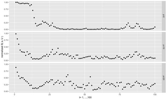 All the previous experiments are based on the true initial value , but, in practice, this is unknown. The filtering algorithm may be sensitive to the choice of the initial value. In the following experiments, we look into the effect of a wrong initial value. The setting is , , and , and we use as initial value , which is the furthest point in the Stiefel manifold away from the true one. Figure 9 depicts the results. We see that in all the experiments the normalized distances move towards zero, hence the filtered values approach the true values in no more than 20 steps. After that, the level and dispersion of the distance series are similar to what they are in Figure 4 where the true initial value is used. Thus, we can conclude that the effect of a wrongly chosen initial value is temporary.