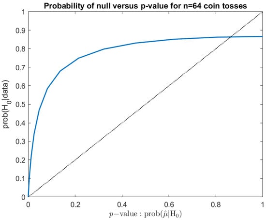 Using these assumptions gives us the value given above. Of course, varying counts of heads give different probabilities and p-values, with the relation between the two for the 64 coin tosses shown in Figure 1. If the p-value gave the probability that the hypothesis were true, the plot would lie along the 45° line. However, it does not do so. Regardless, the more important lesson is that the curve is often very far from the 45° line, and indeed, it can lie either above or below.